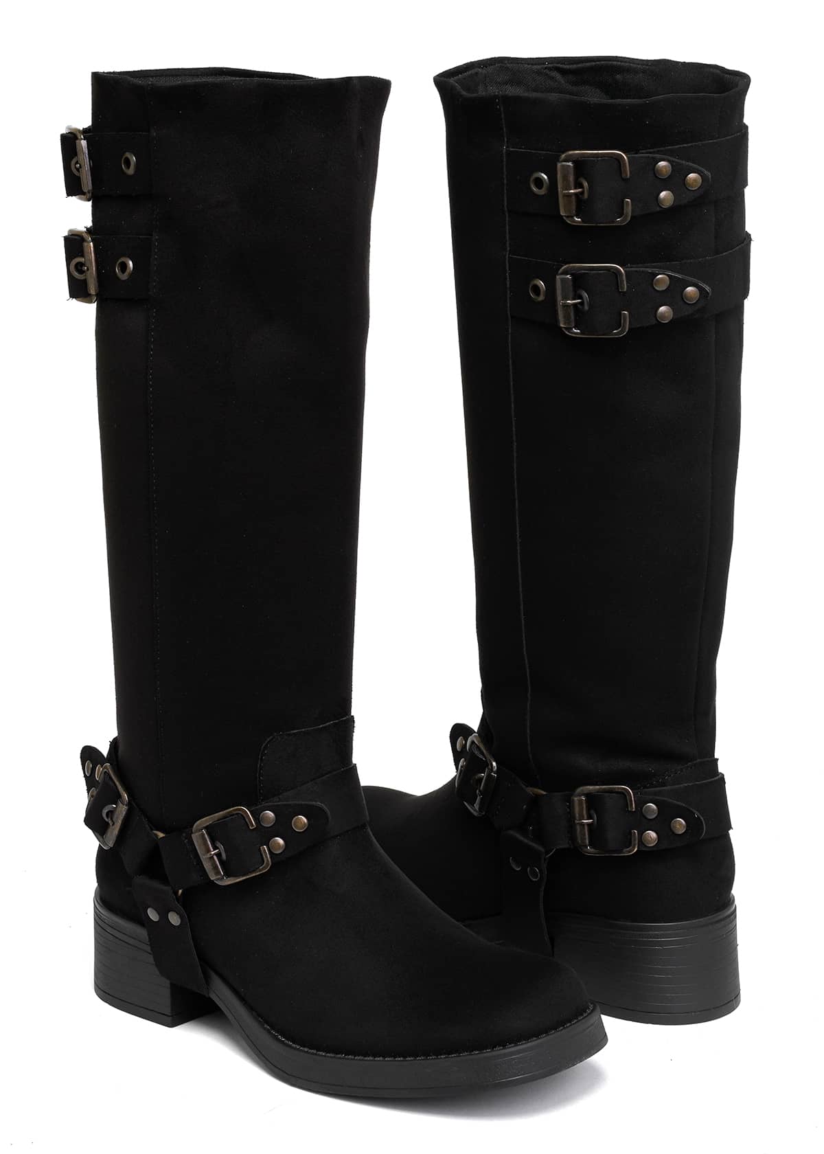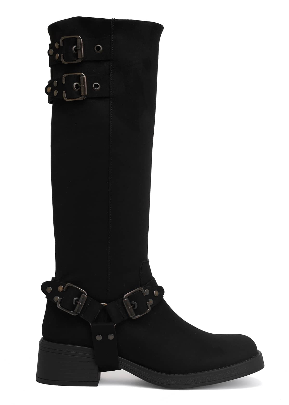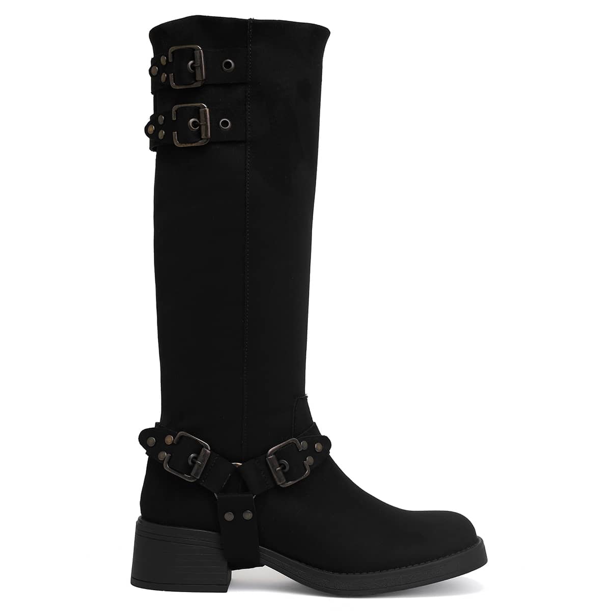 Su diseño alto hasta debajo de la rodilla abraza la pierna con estructura y estilo, mientras las hebillas metálicas añaden ese toque rebelde que te recuerda que la fuerza también puede ser femenina.