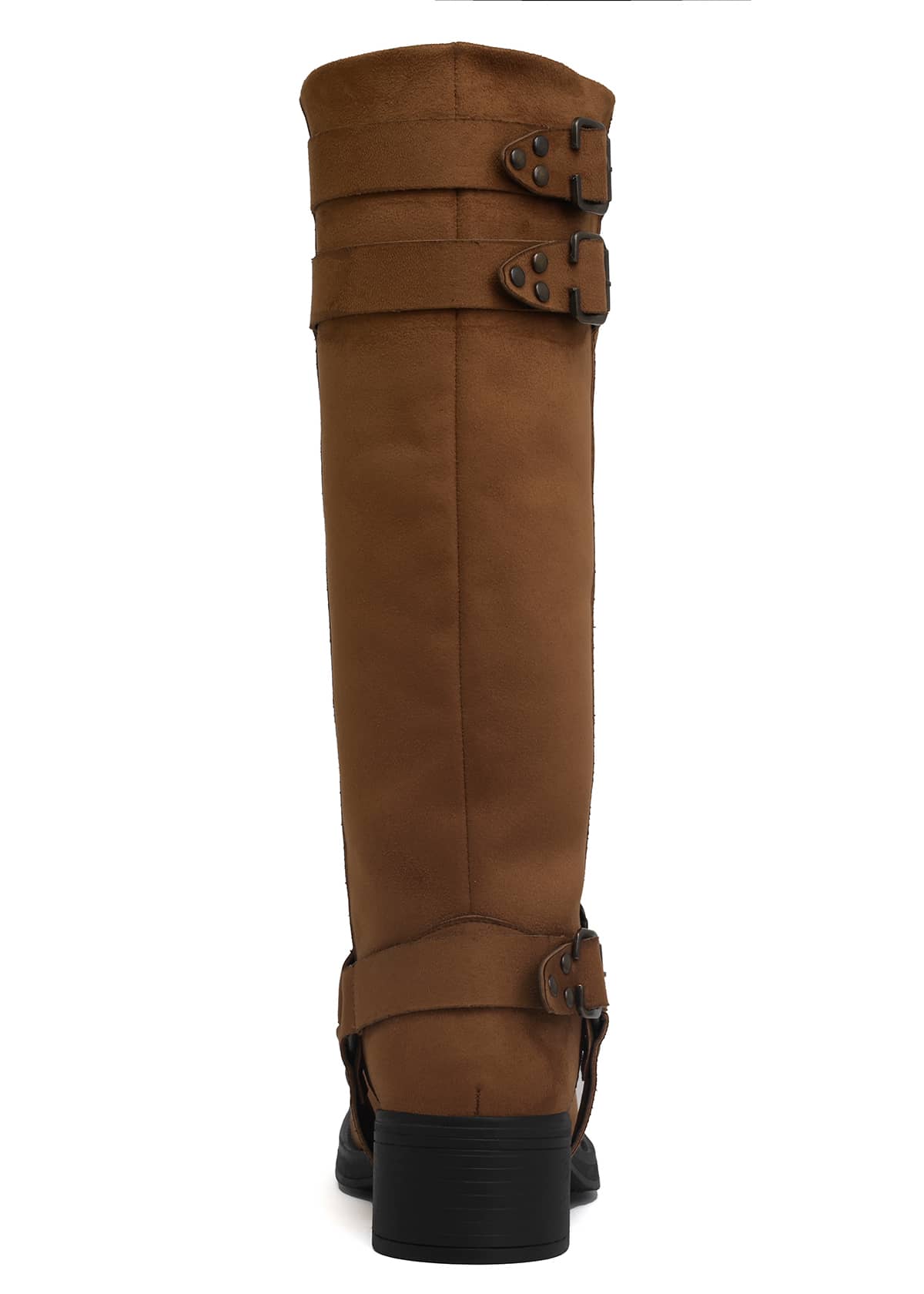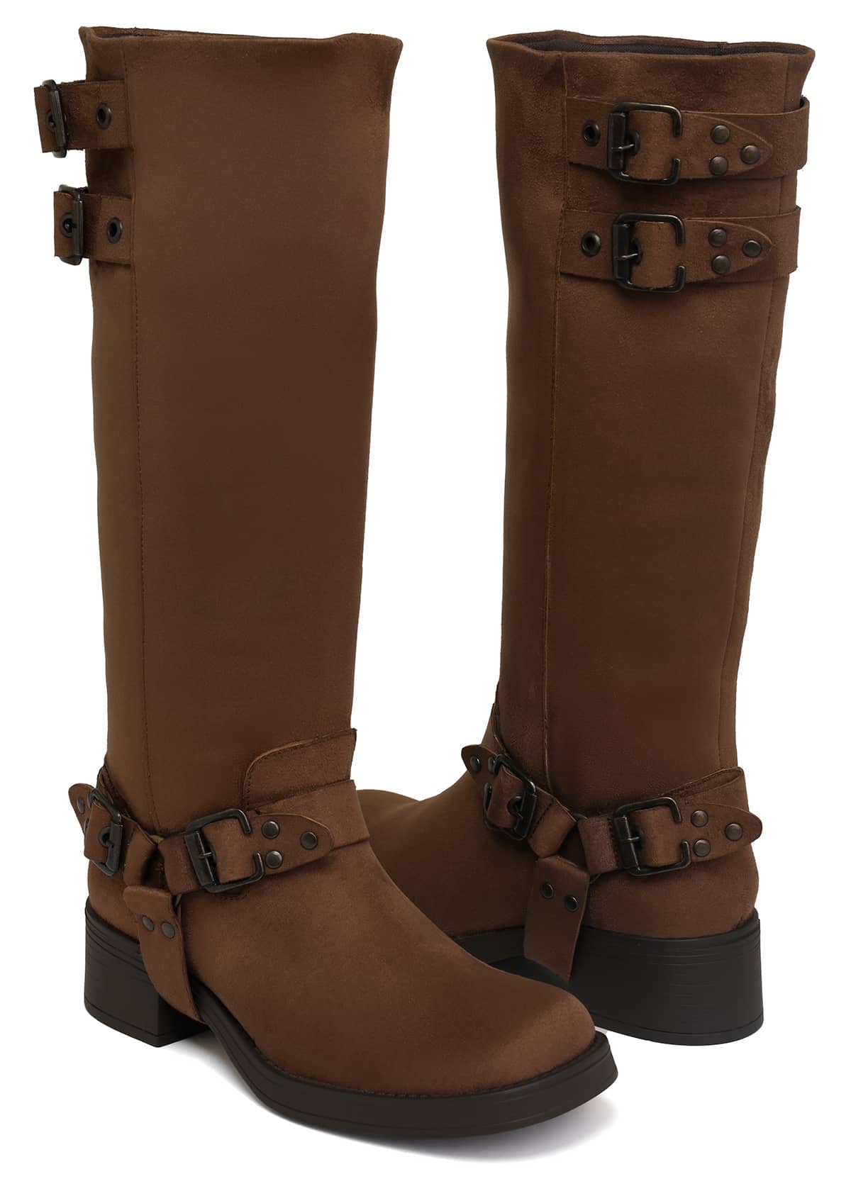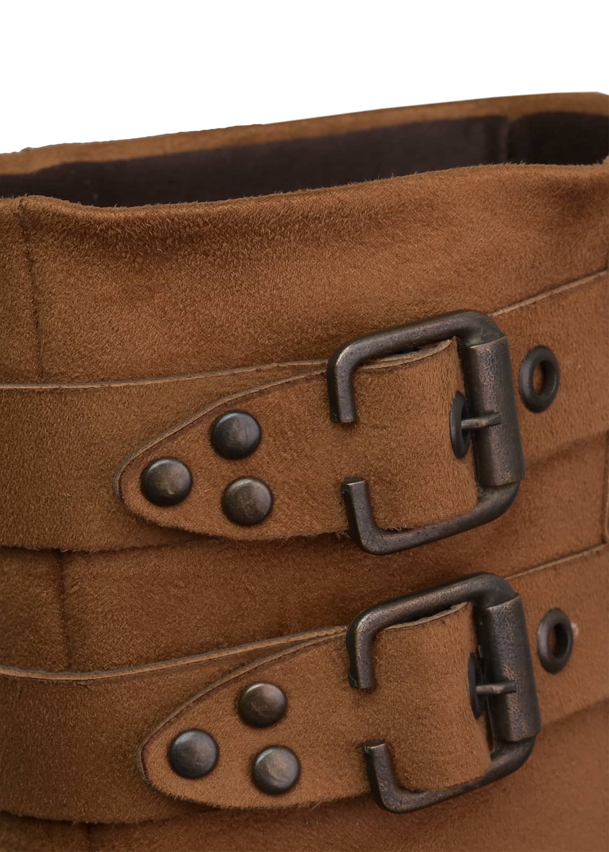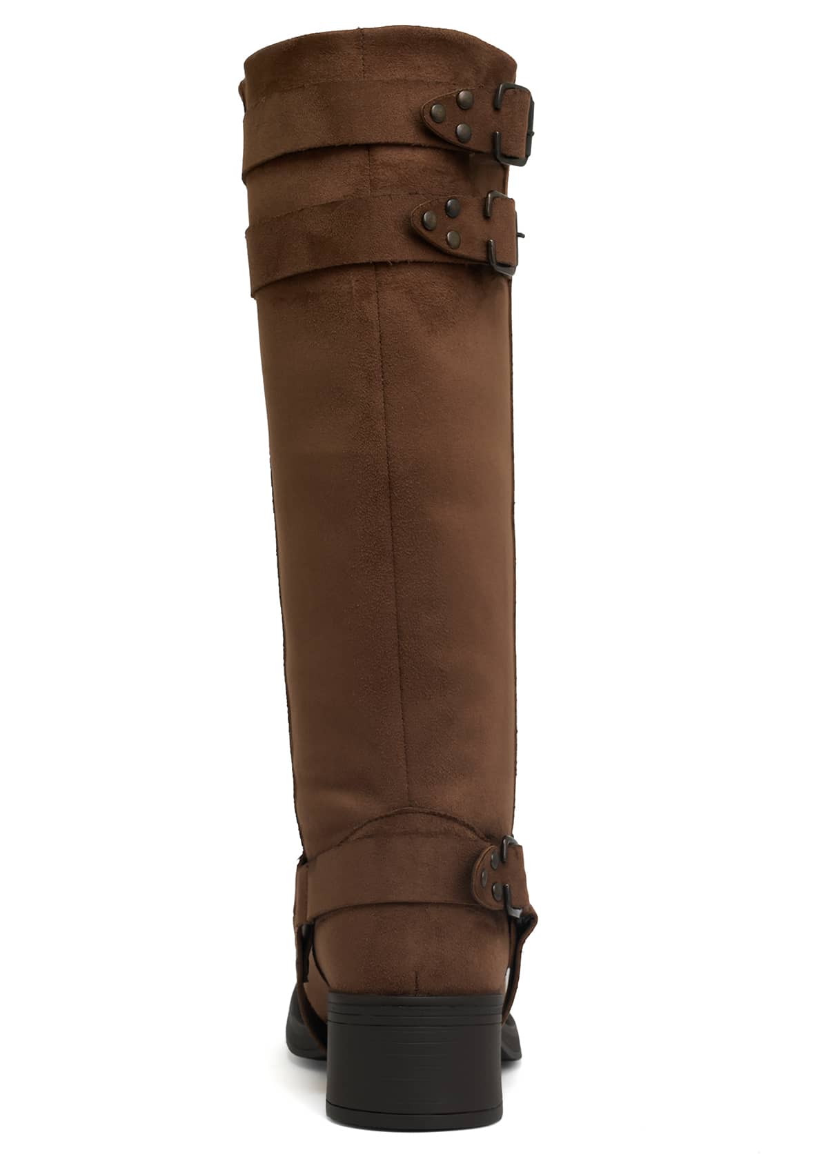 Su diseño alto hasta debajo de la rodilla abraza la pierna con estructura y estilo, mientras las hebillas metálicas añaden ese toque rebelde que te recuerda que la fuerza también puede ser femenina.