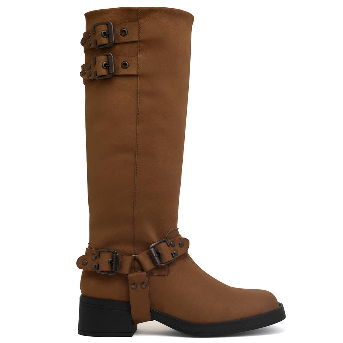 Su diseño alto hasta debajo de la rodilla abraza la pierna con estructura y estilo, mientras las hebillas metálicas añaden ese toque rebelde que te recuerda que la fuerza también puede ser femenina.