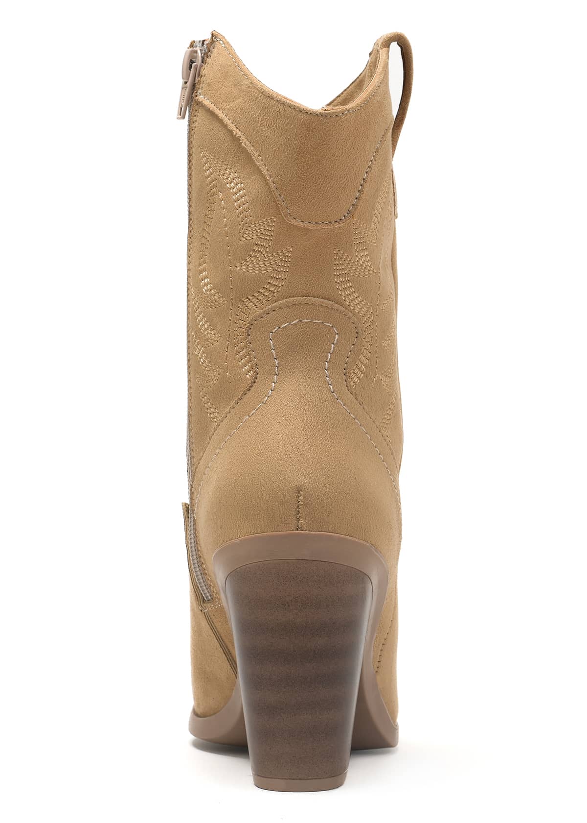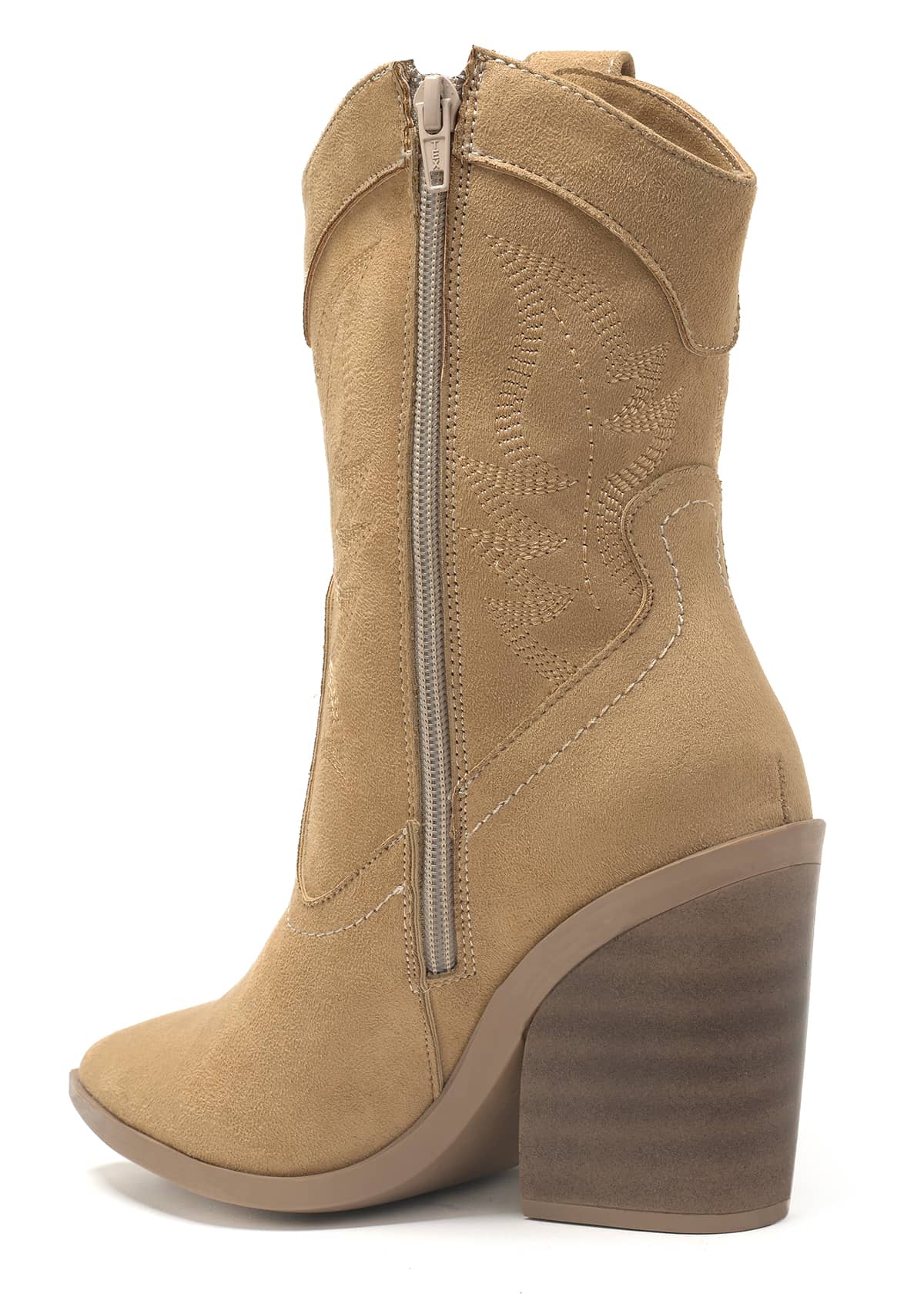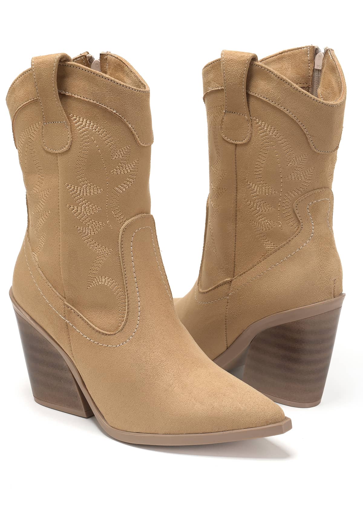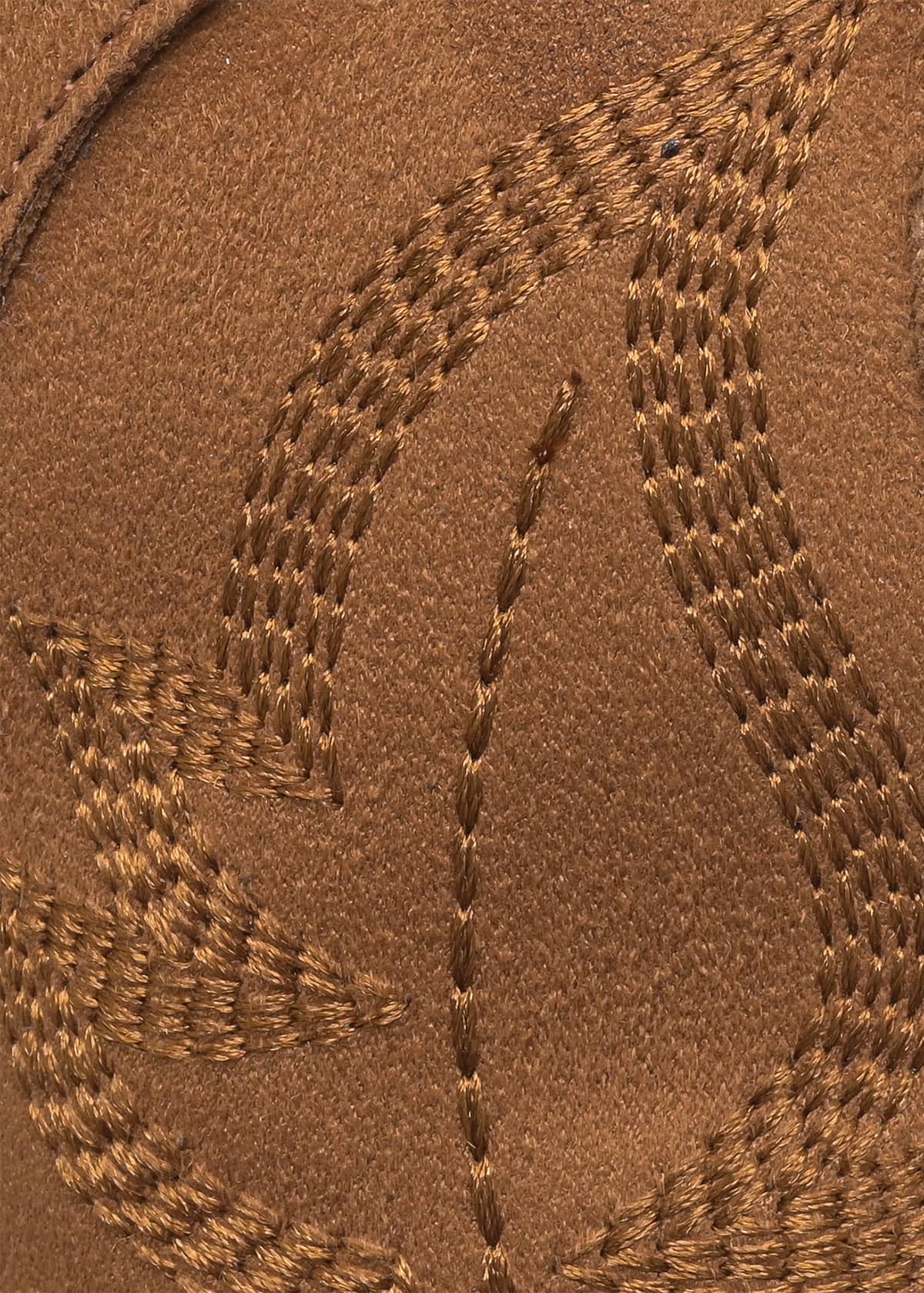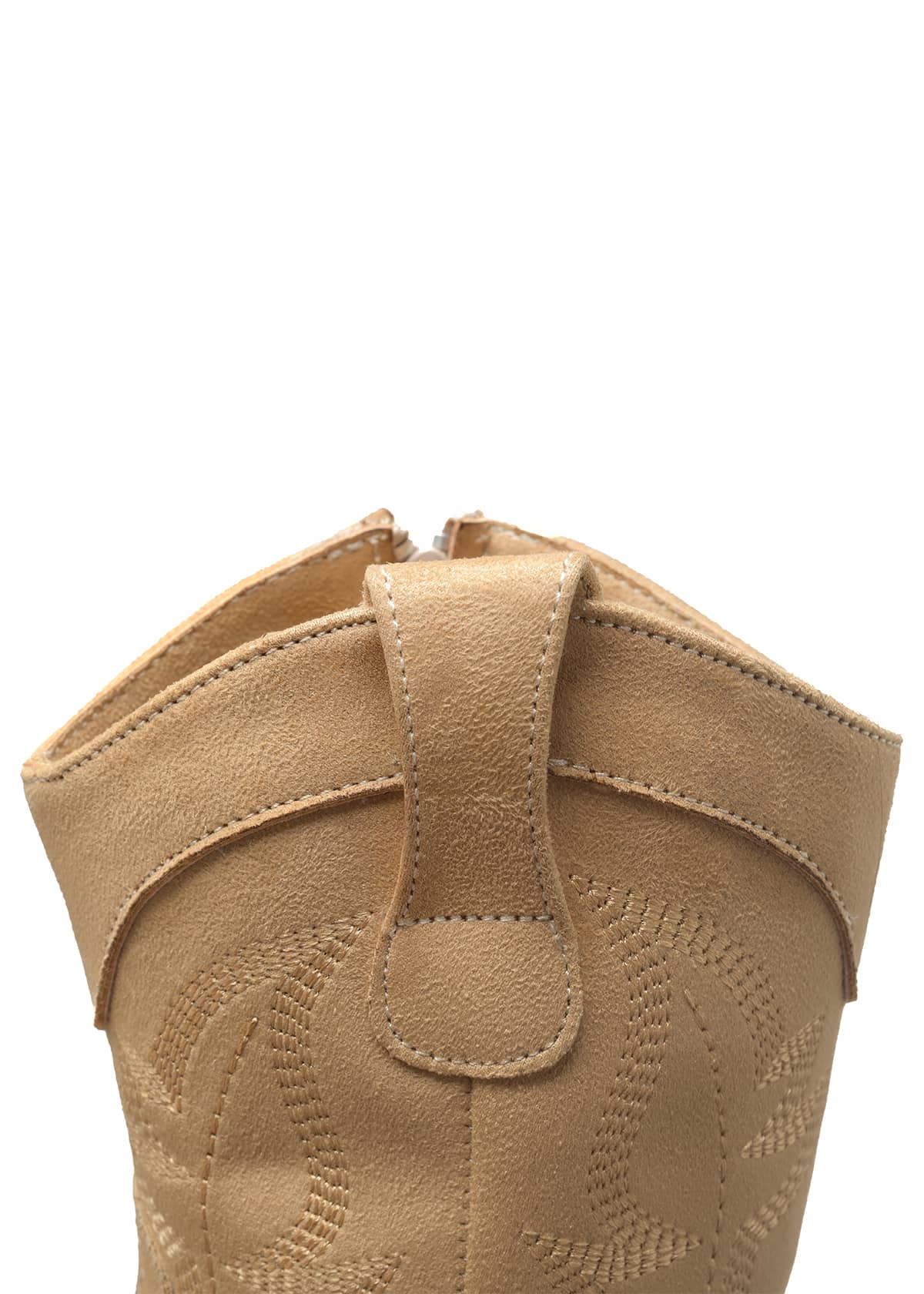 Inspirado en el encanto del viejo oeste, este botín bordado fusiona lo clásico y lo moderno con una silueta femenina y favorecedora. Su acabado tipo gamuza aporta suavidad visual y una textura elegante que realza el diseño artesanal del bordado al tono. Cada puntada refleja dedicación y estilo, pensado para mujeres que buscan marcar presencia sin perder naturalidad.